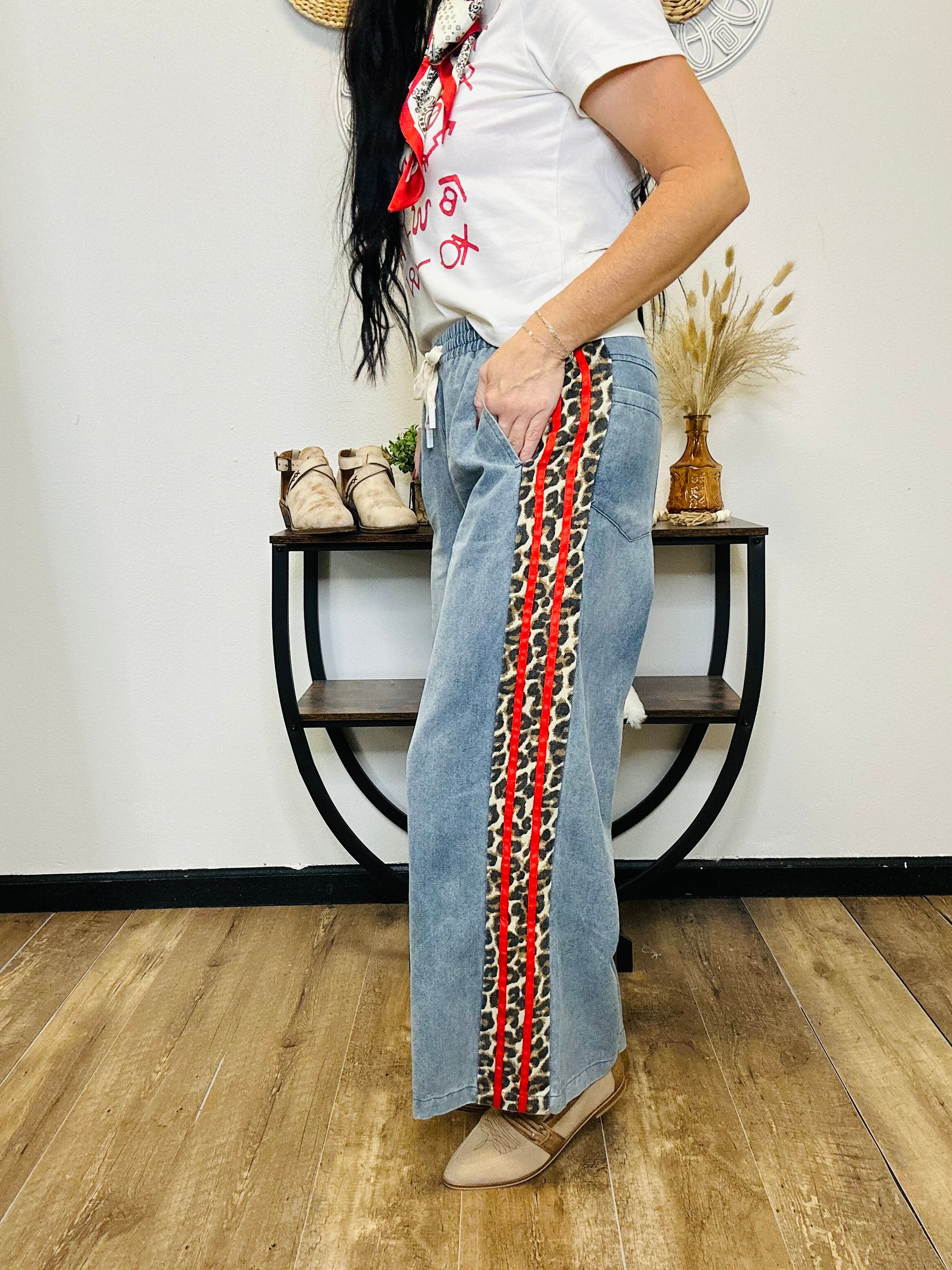 Women's Wide Leg Denim Pants with Leopard and Red Stripe Accents