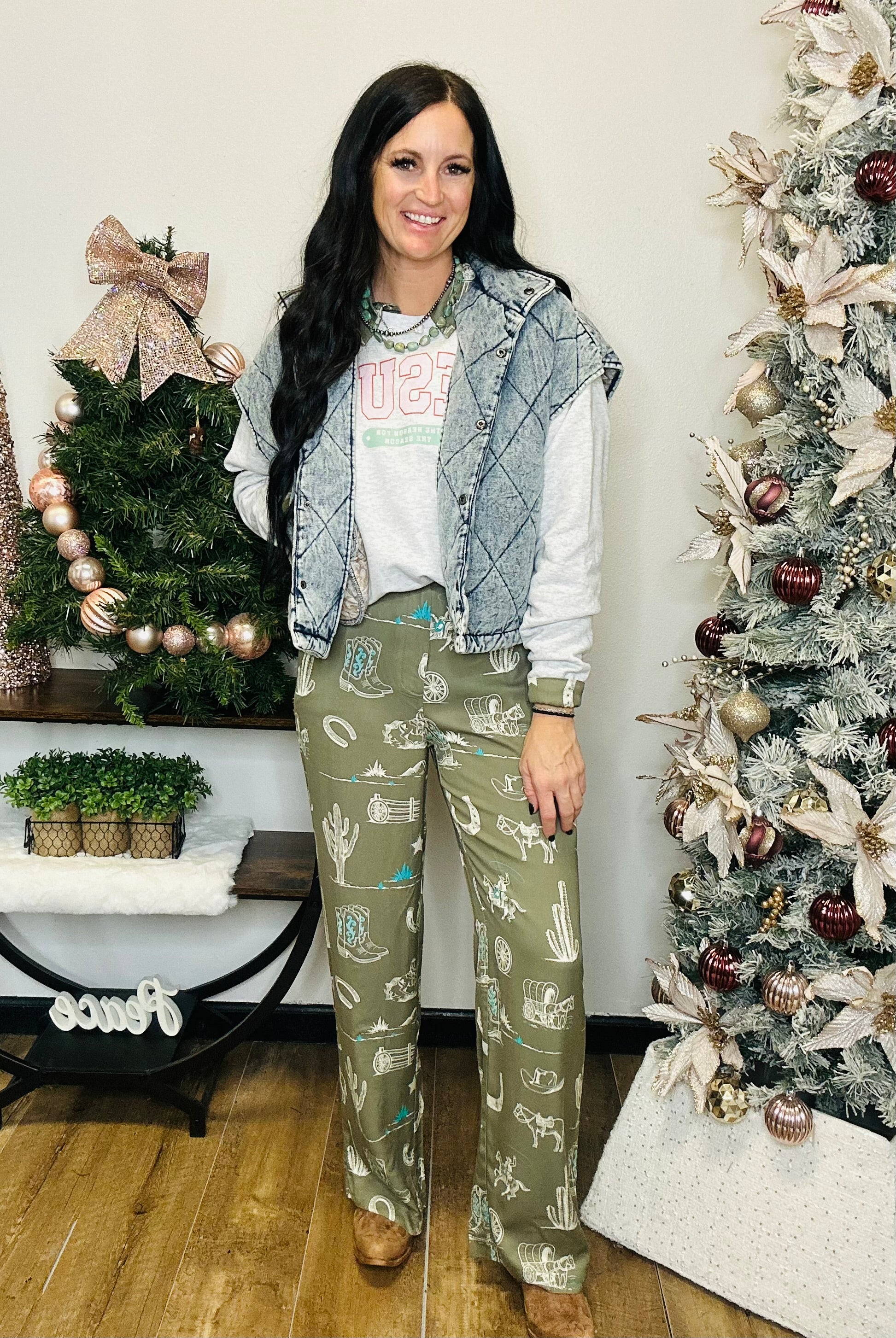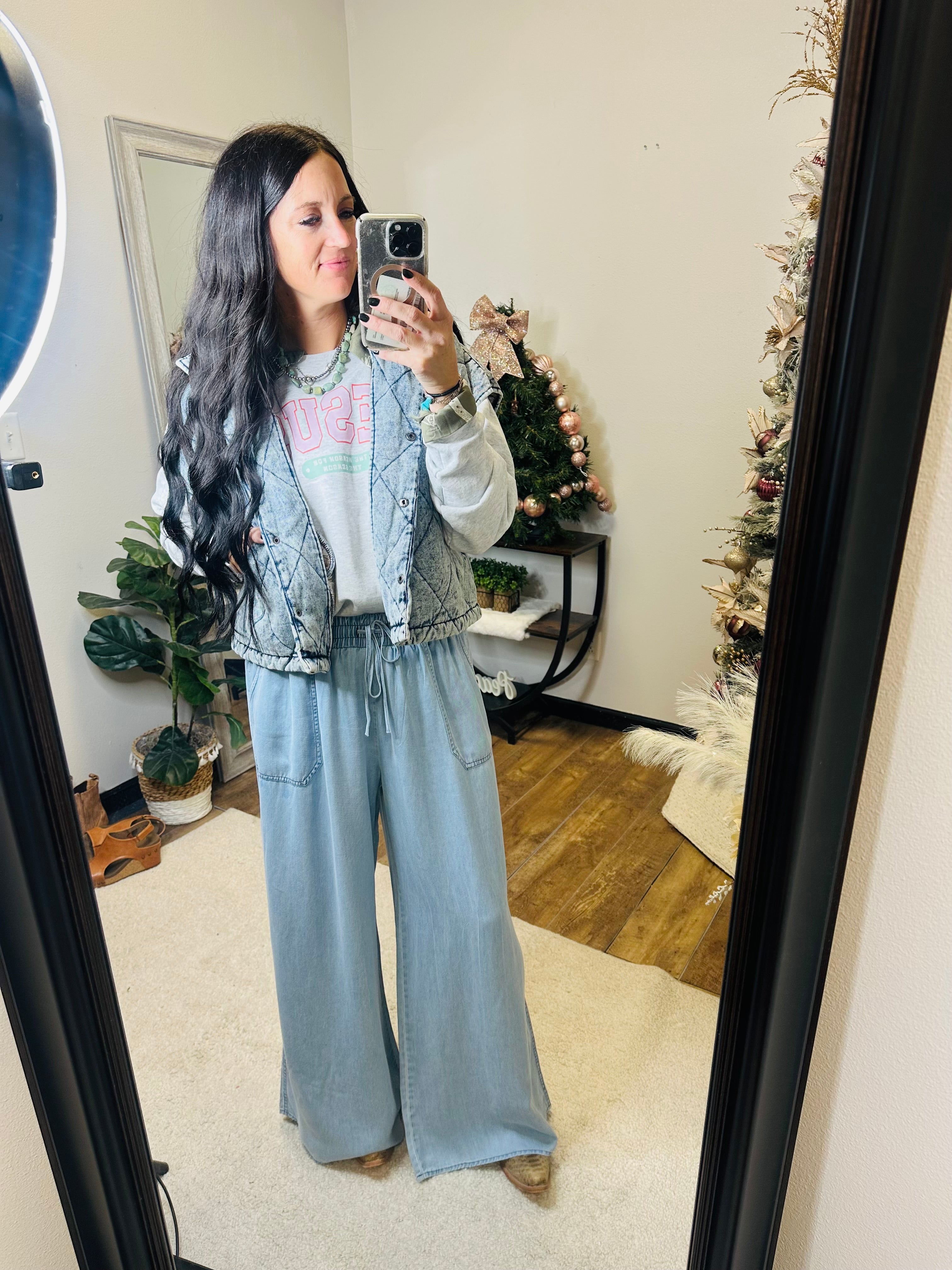 Bring a touch of vintage western charm to your wardrobe with our Dixie Denim Quilted Vest — the perfect piece for layering season after season. Crafted from soft, vintage-washed denim with a cozy quilted texture, this vest blends rugged charm with a laid-back, boho edge. The oversized fit and high neck collar make it a go-to for tossing over your favorite graphic tee, lightweight sweater, or flannel. Whether you’re headed to the rodeo, running errands, or styling it up for a night out, this vest delivers that signature Motis mix of modern style and western flair.