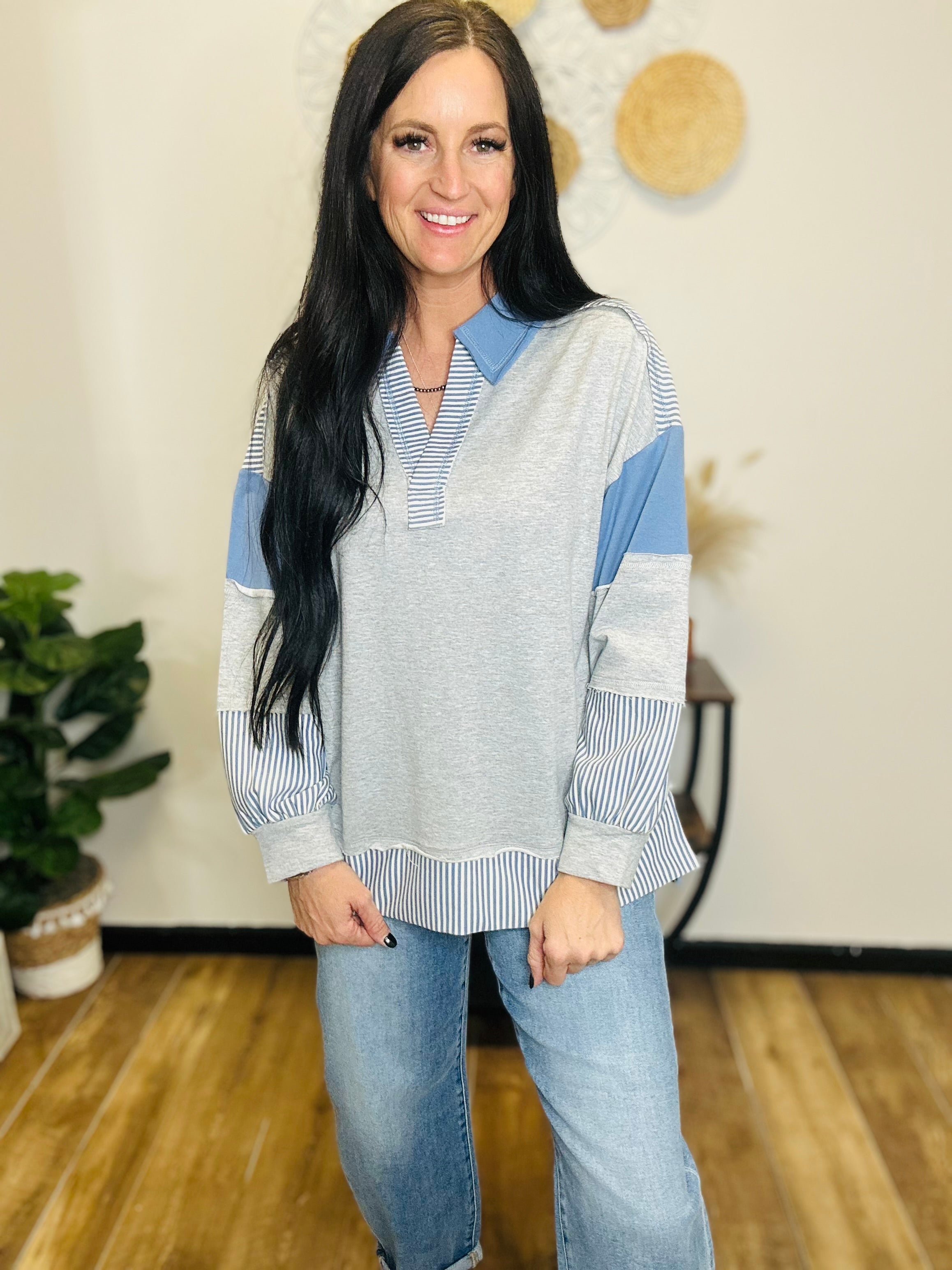 Cool, comfy, and perfectly western-chic — our Brynn Color Block Collared Pullover is a laid-back favorite with a stylish twist. This oversized knit features a modern mix of solid grey and soft blue stripes, giving it that casual yet polished vibe we love. The collared neckline and hi-lo hem add a touch of structure, while the drop shoulder fit keeps it effortlessly relaxed. Perfect for chilly mornings, casual Fridays, or weekend adventures — it’s the kind of top that pairs seamlessly with denim and boots for that signature Motis look.