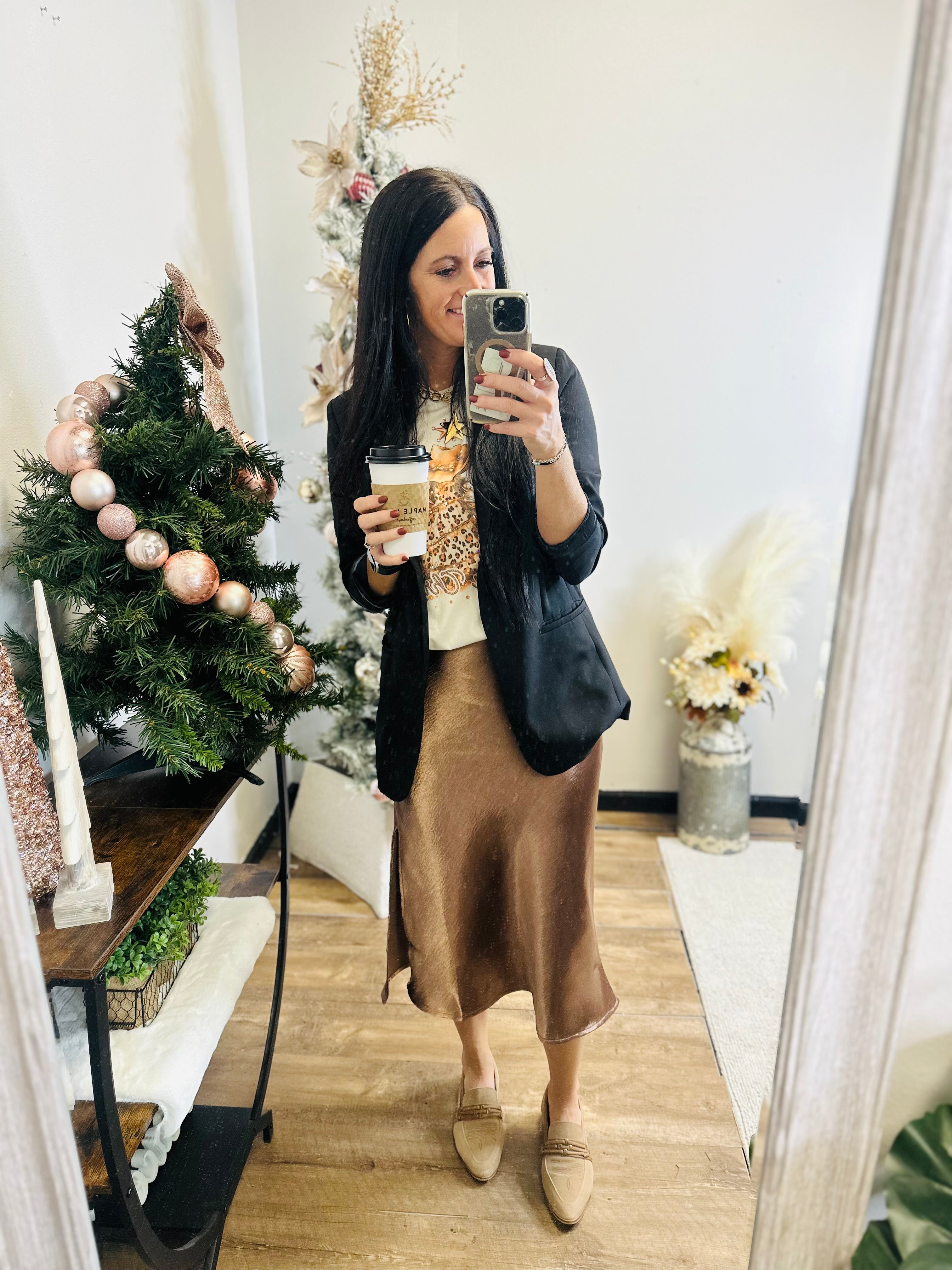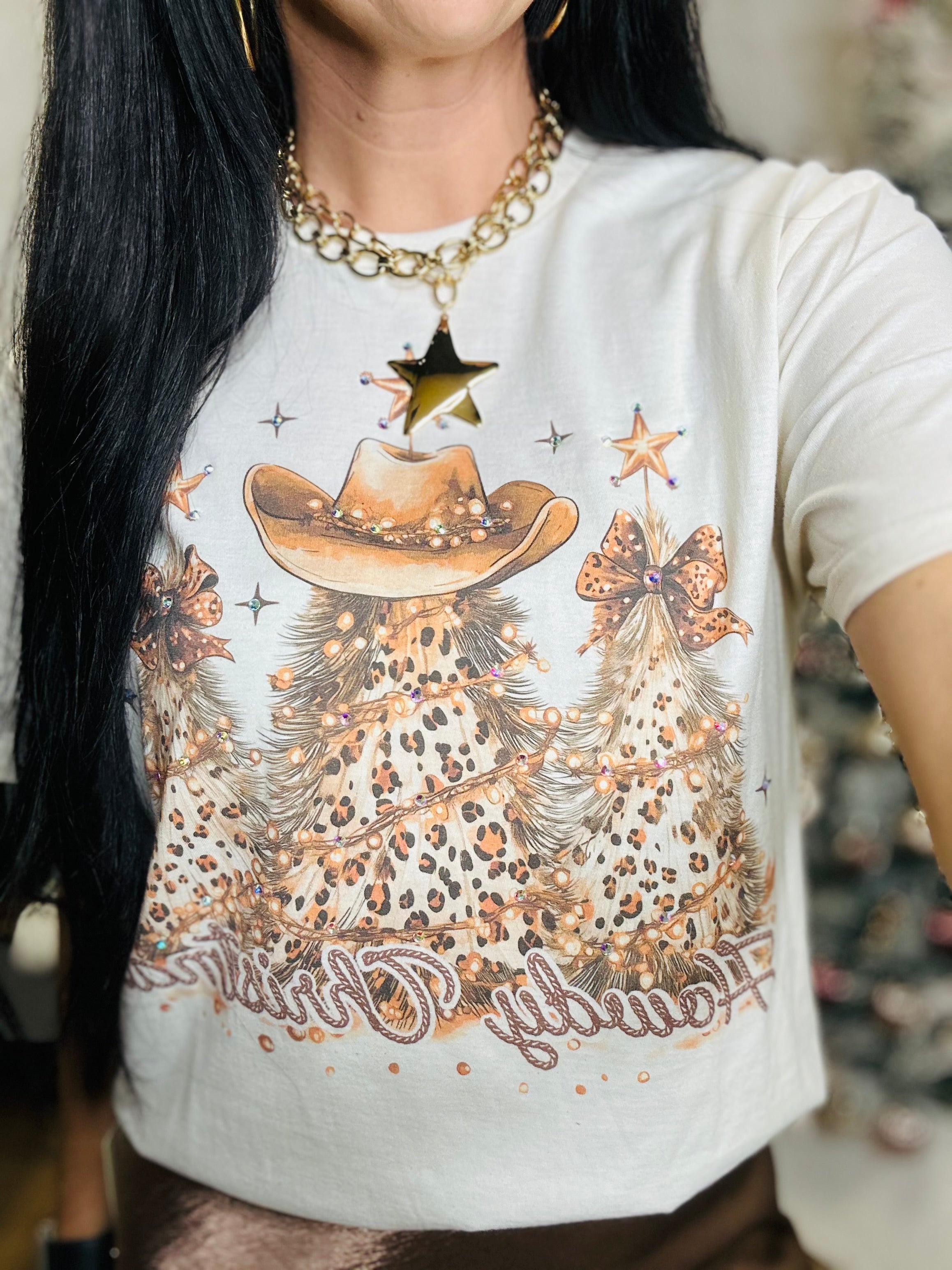 The Howdy Tee brings a little western spirit and a whole lot of Christmas sparkle! This short sleeve graphic tee features festive western-style Christmas trees and just the right touch of gold bling to make your outfit shine. Soft, comfy, and perfectly playful, it’s made for those who love a little extra sparkle in their season.
