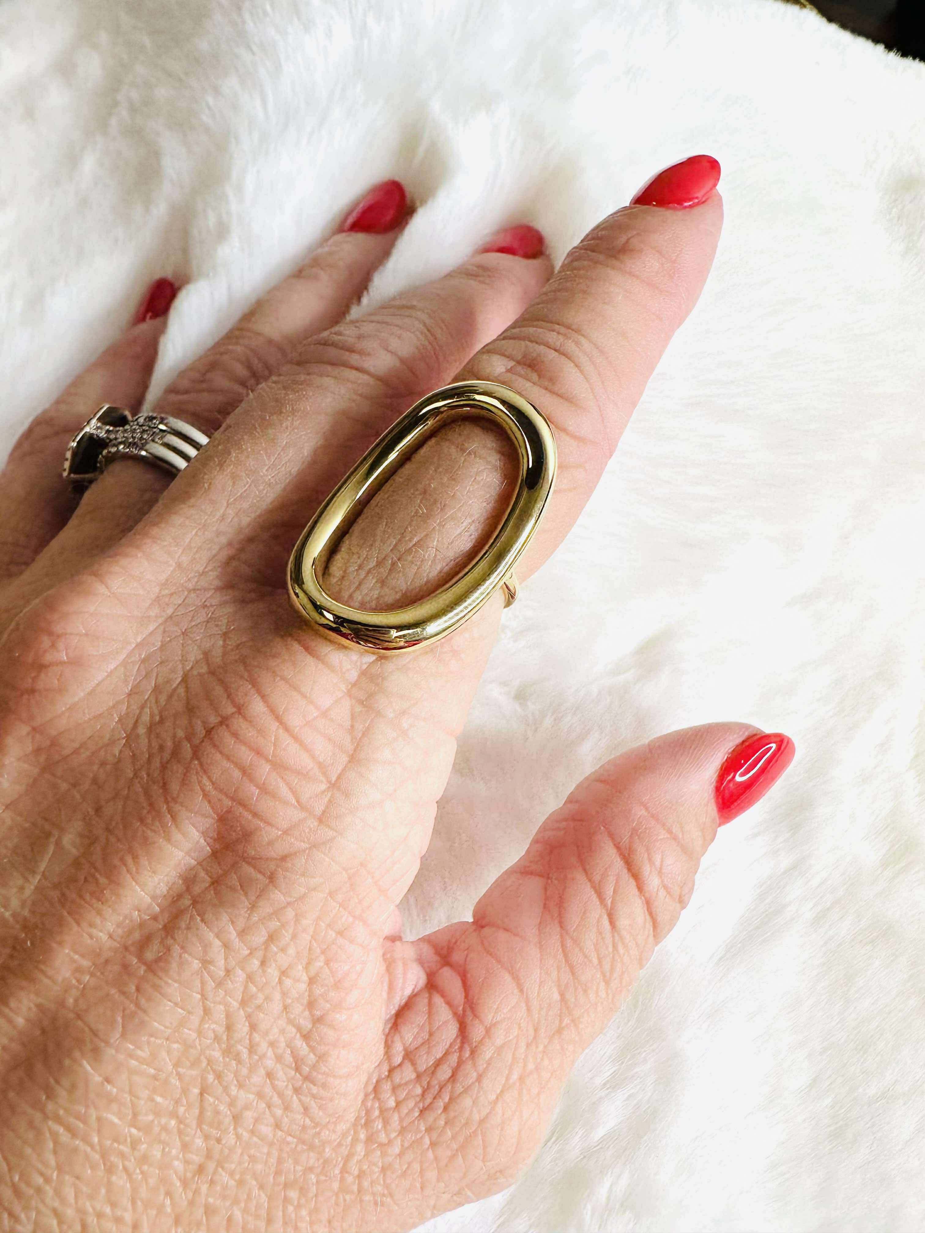 Add a touch of bold elegance to your look with The Amanda, a chunky gold circle ring designed to fit just right every time. Crafted from water-resistant stainless steel and finished with lustrous 18k gold plating, this adjustable ring shines with durable, lasting brilliance. Embrace versatility and style with this must-have statement piece.