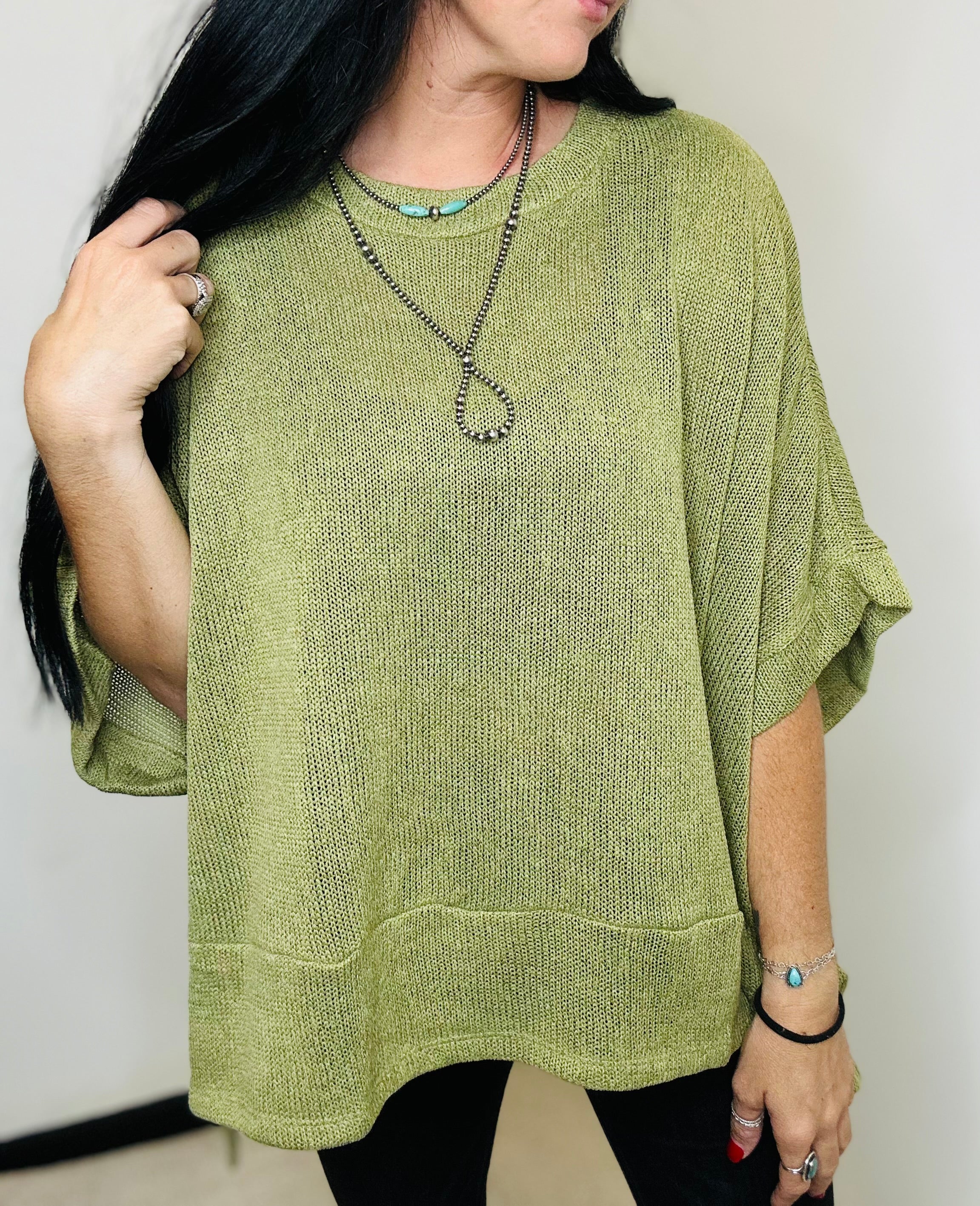 Relaxed Fit Lightweight Poncho Style Knit Sweater in Avocado Green