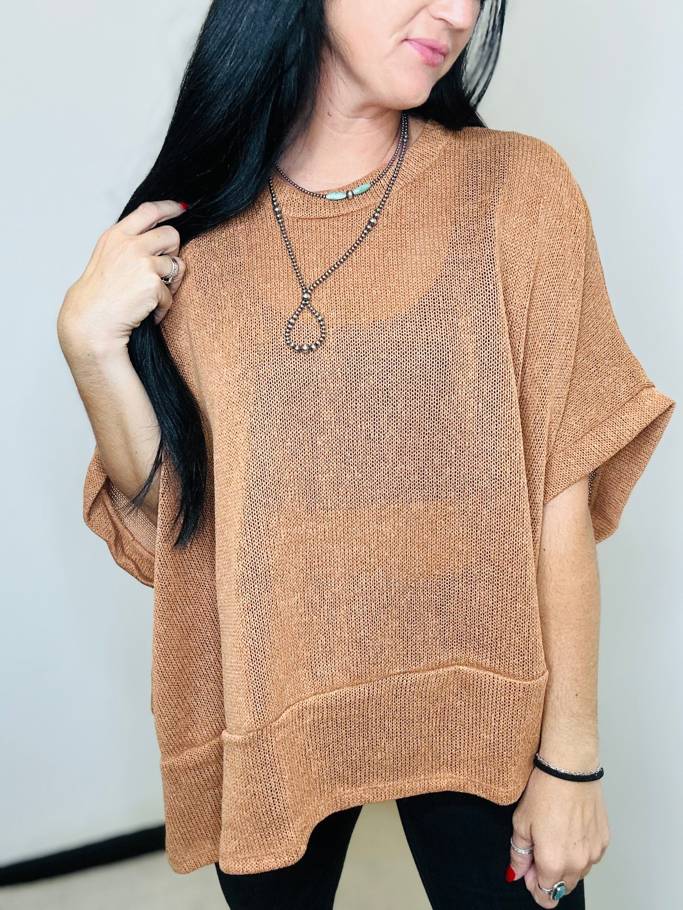 Relaxed Fit Lightweight Poncho Style Knit Sweater in Toffee Brown