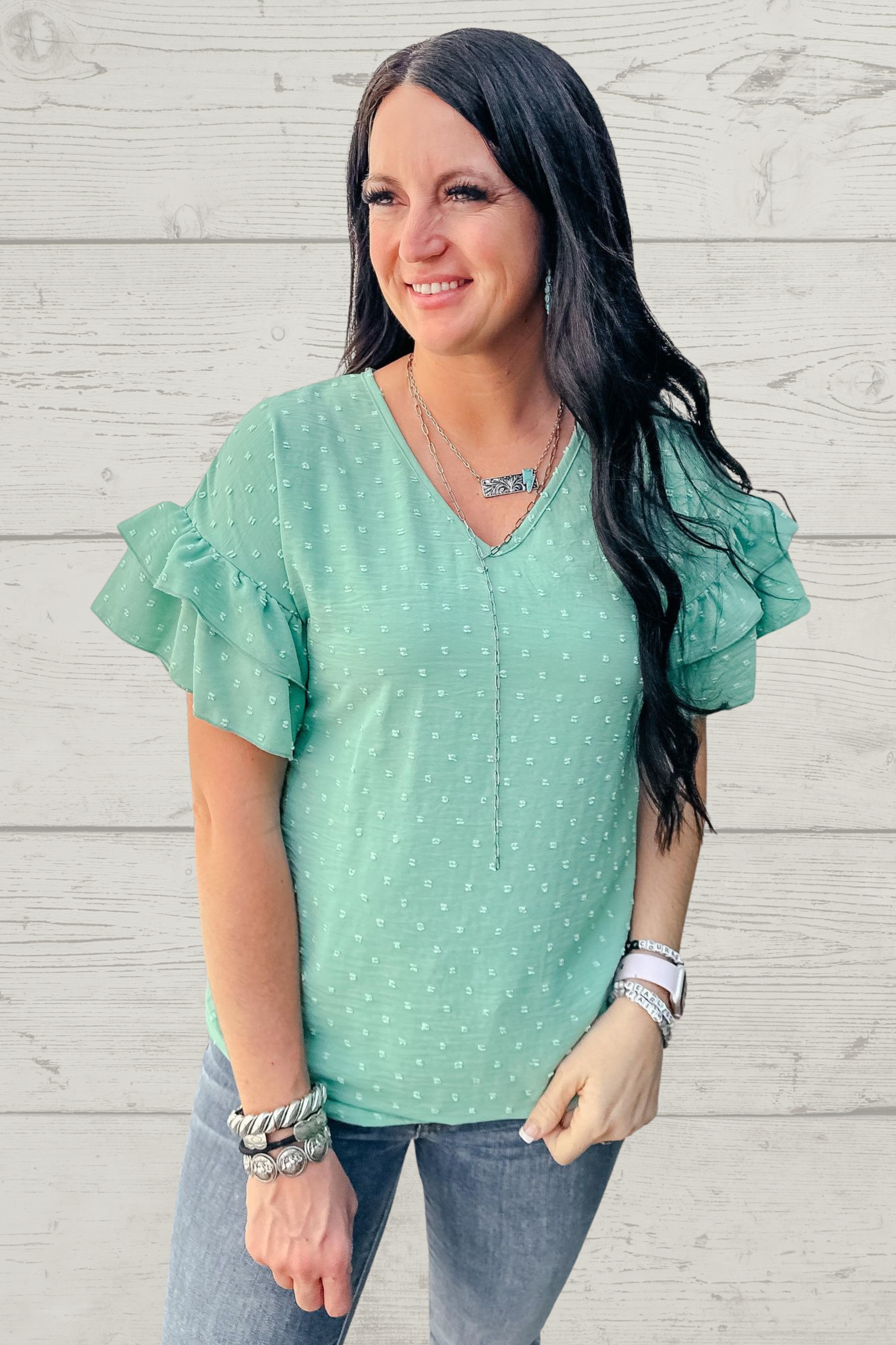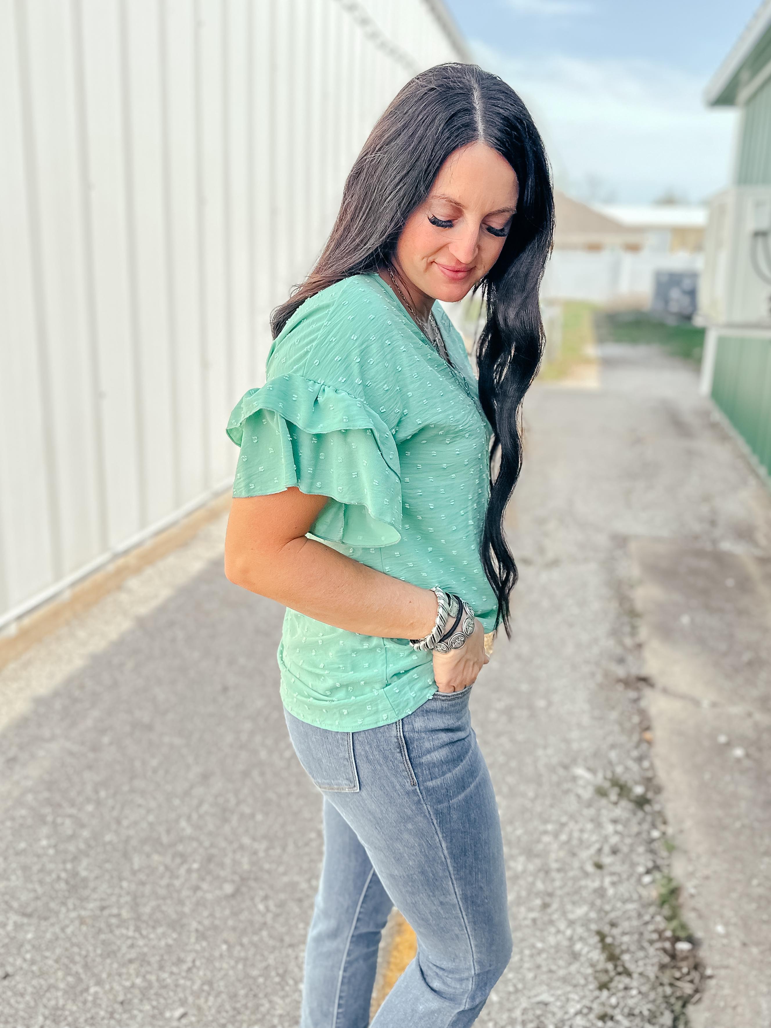 Sashay into spring with our Sallie Mint Dot Ruffle Sleeve Top! This playful V-neck top features short sleeves with double ruffle detailing and a textured dotted knit. Dress it up for the office or keep it casual with jeans - either way, you'll be adding a touch of fun to any outfit. (Office chic or weekend cool, this top has got you covered!