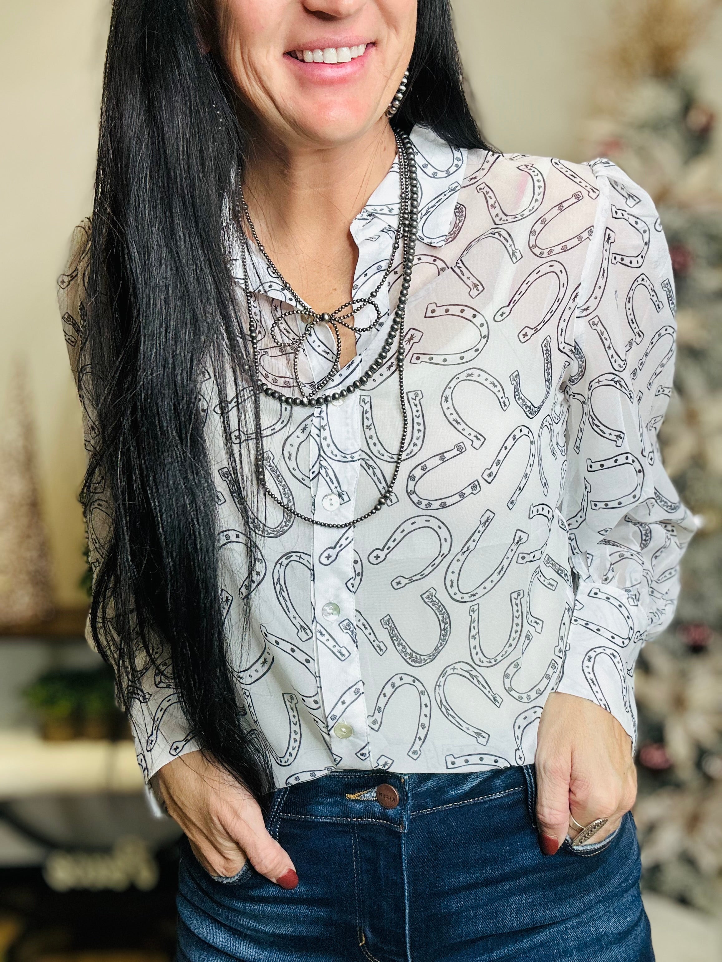 The Hallie Blouse is soft, feminine, and full of subtle western charm. This sheer white button-up features a navy horseshoe print that adds the perfect hint of cowgirl spirit without feeling over the top. With its bubble sleeves, smocked cuffs, and flowy fit, Hallie feels light, graceful, and perfectly easy to wear.
