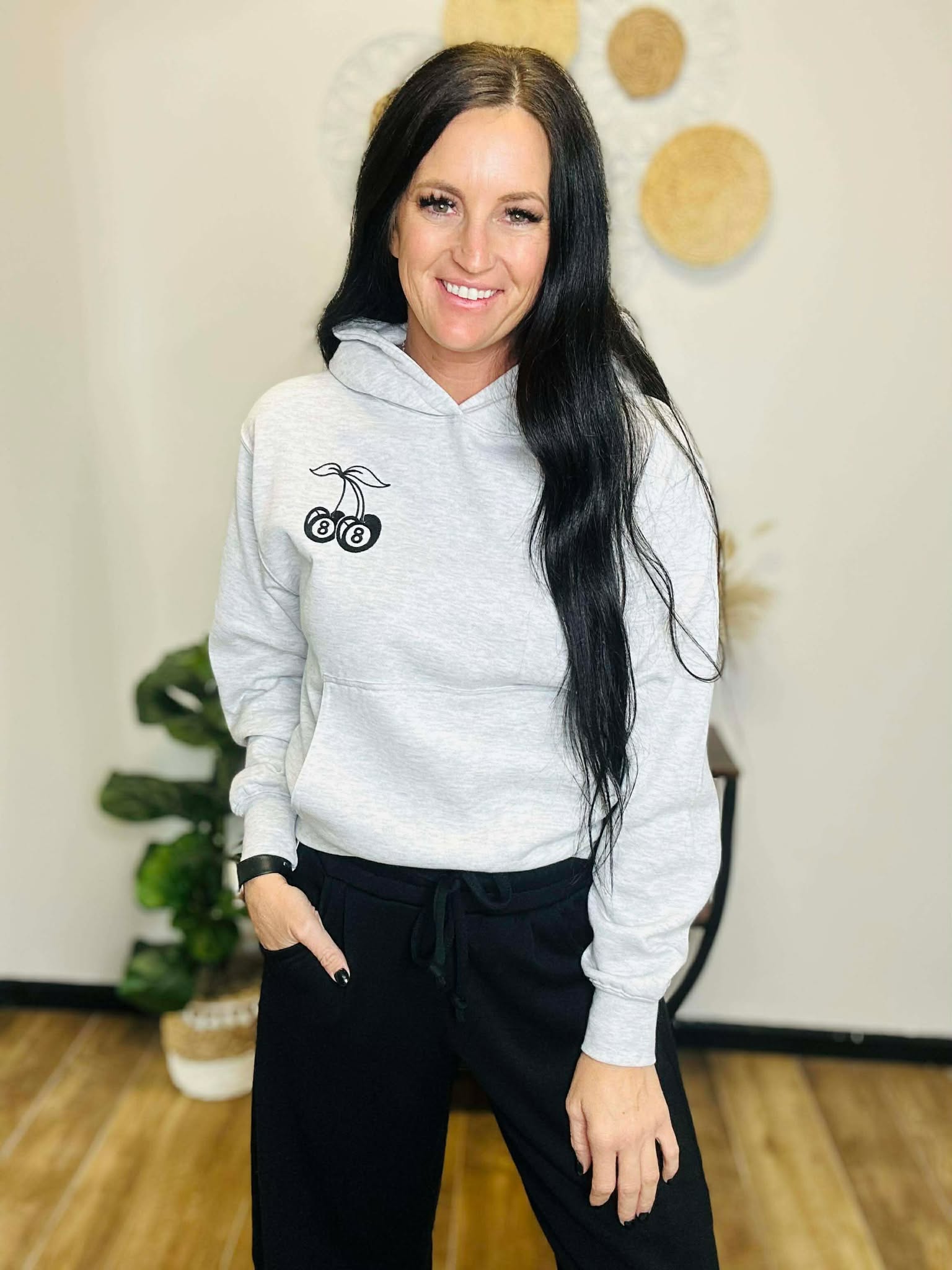 Get ready to stay cozy and cute in our Cherry Feeling Lucky Hoodie! This soft grey pullover brings all the vintage-inspired charm with its bold cherry and 8-ball embroidery and playful “Feeling Lucky” graphic. It’s that relaxed, throw-on-and-go hoodie you’ll wear on repeat — from weekend errands to cozy coffee runs.