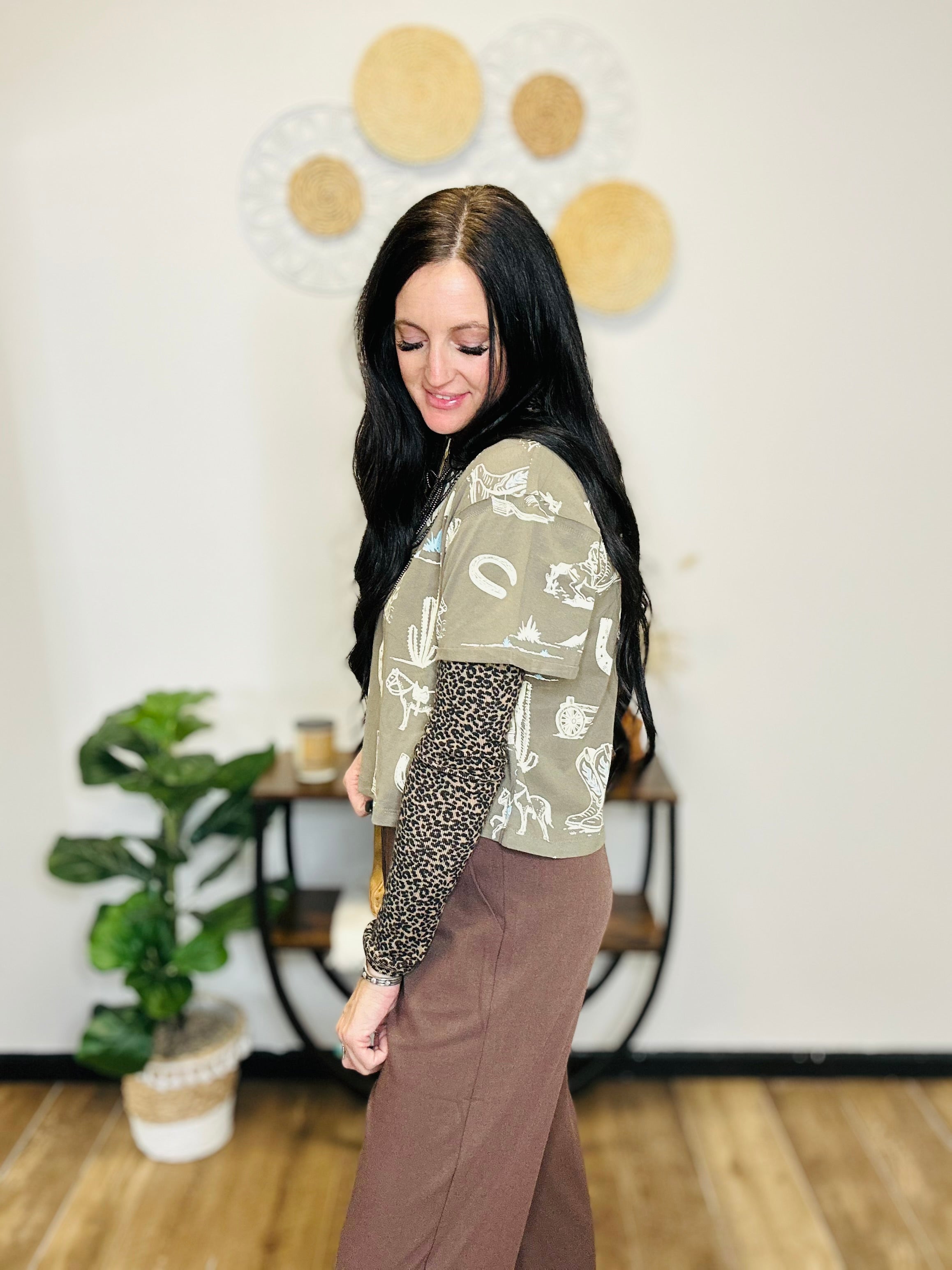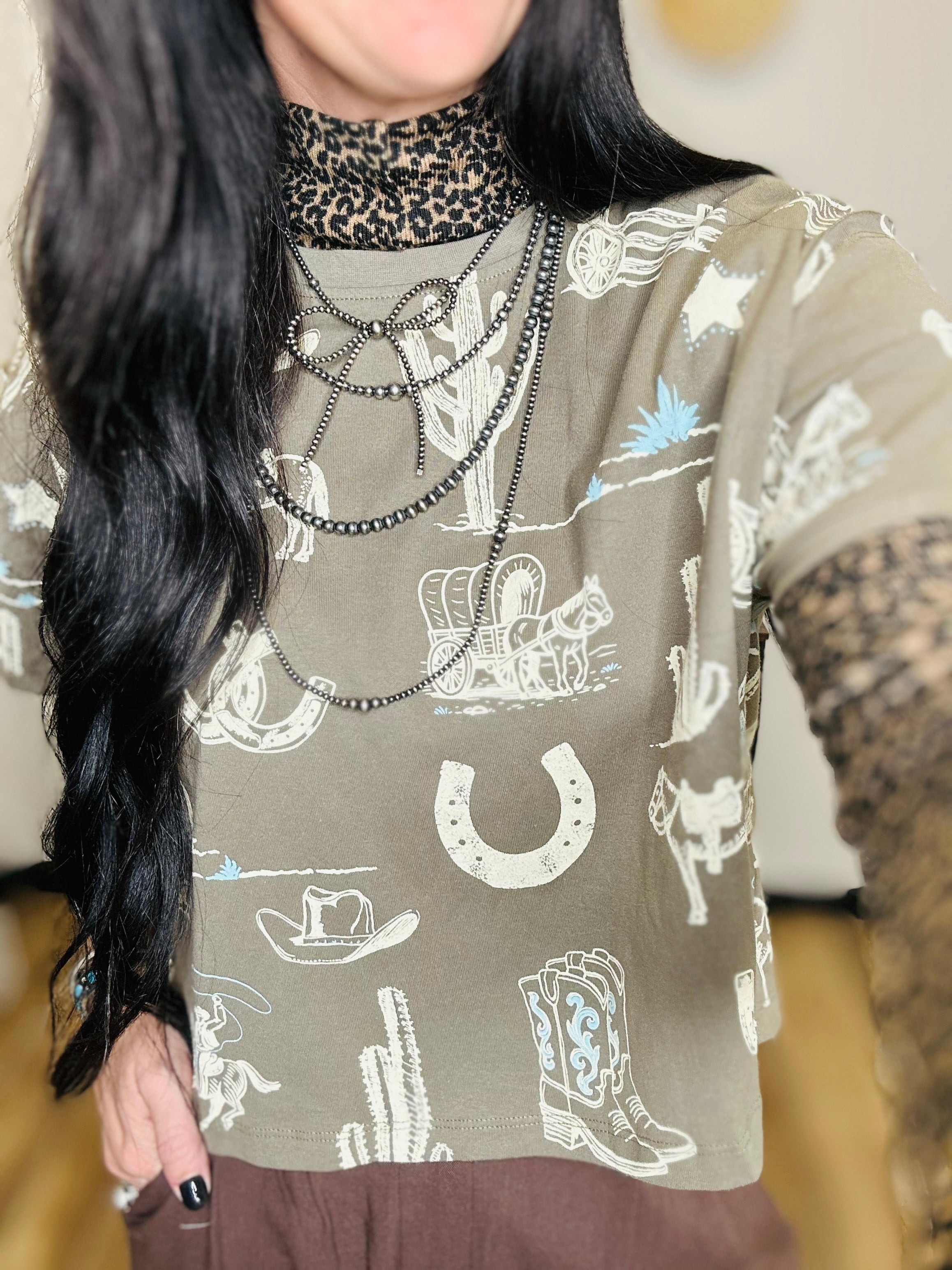 Clancy Western Print Boxy Tee - Olive| Motis and Co Boutique – Motis & CO