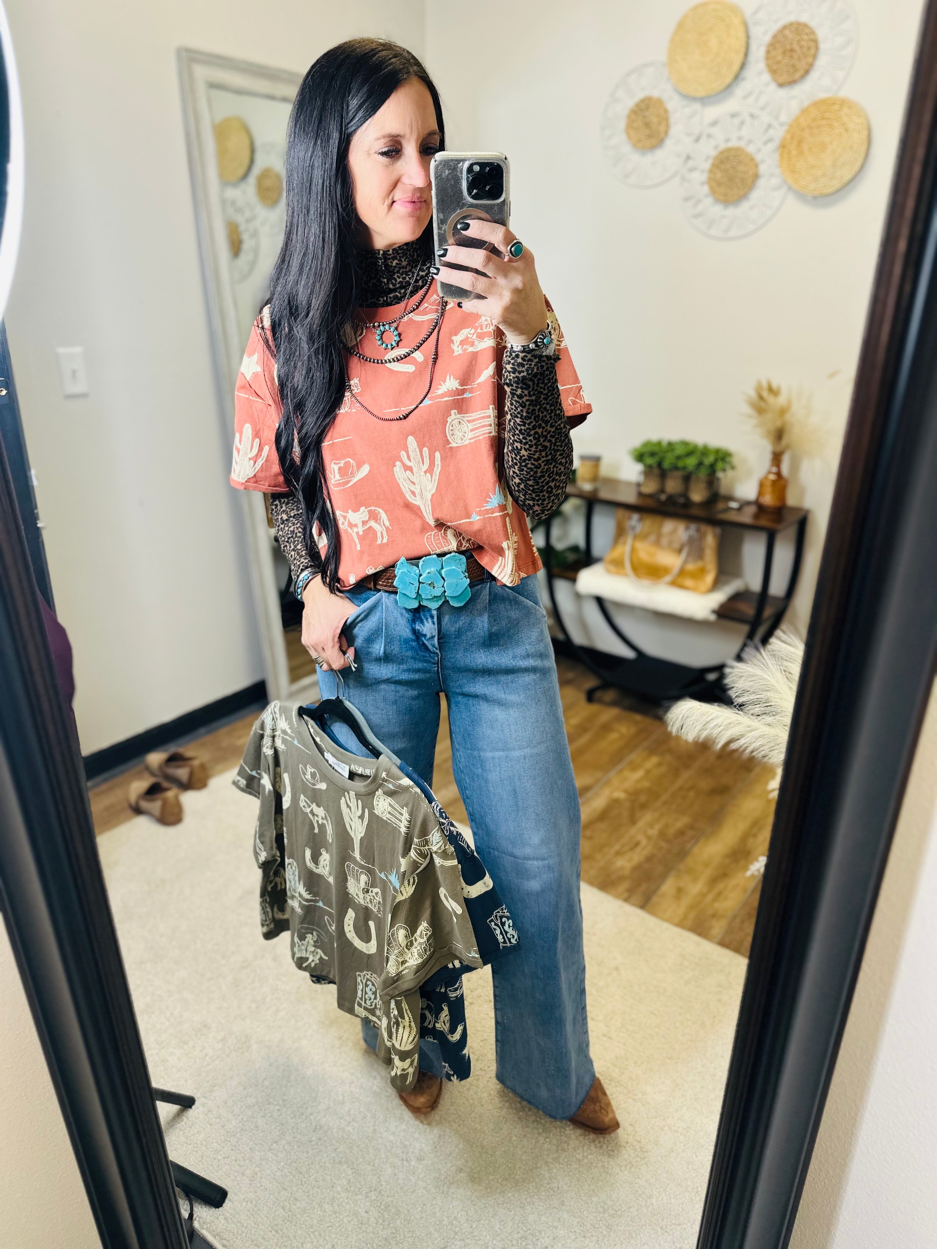 Laid-back meets western chic with our Clancy Western Print Boxy Tee — the perfect blend of comfort and cowboy-cool style. This soft cotton tee has that effortlessly relaxed fit you’ll love, featuring a fun western print that pairs perfectly with denim shorts, Judy Blues, or layered under your favorite shacket. Whether you're running errands, grabbing coffee, or heading to a local rodeo, this tee brings that casual confidence and boho charm Motis gals adore.