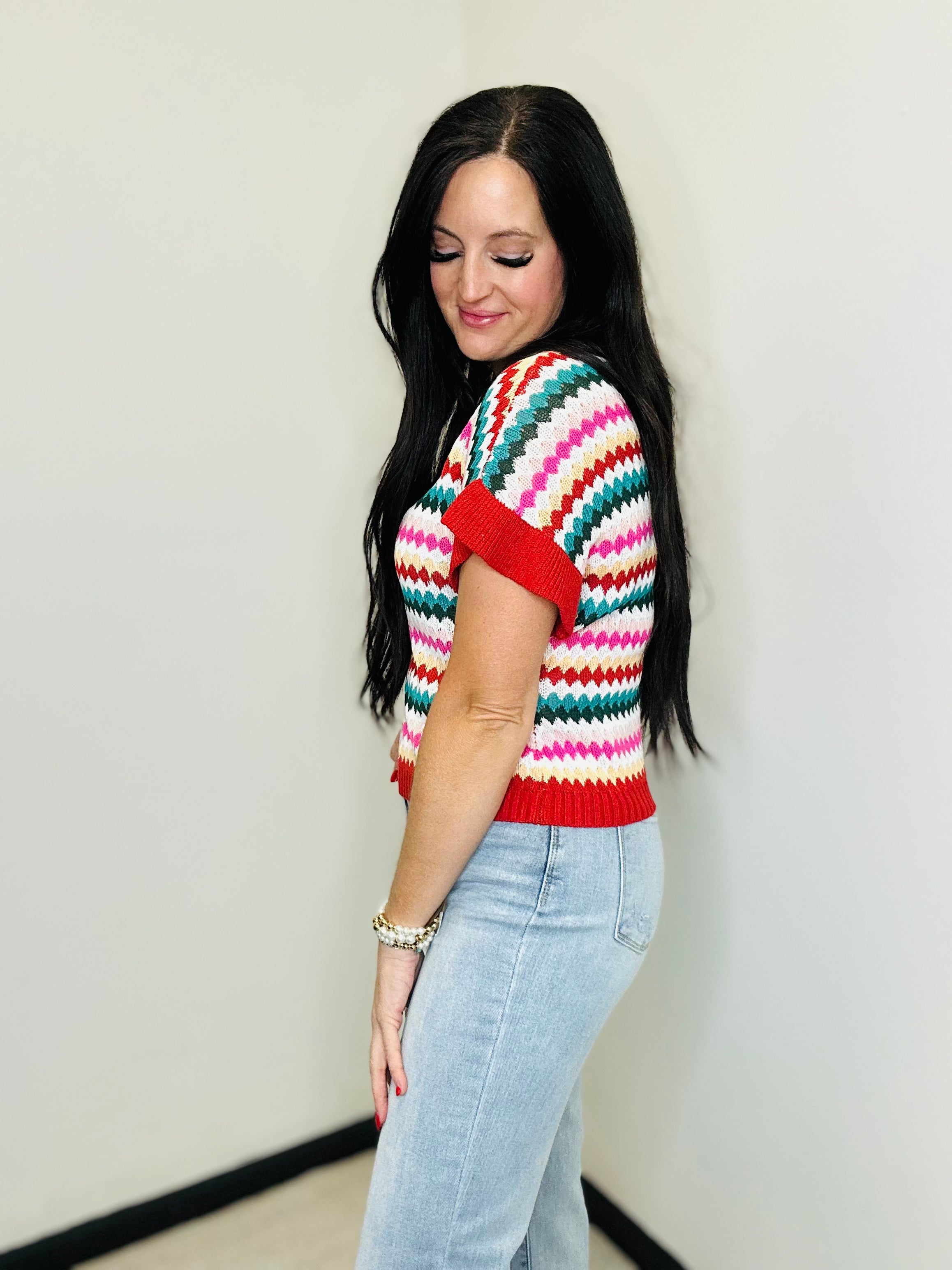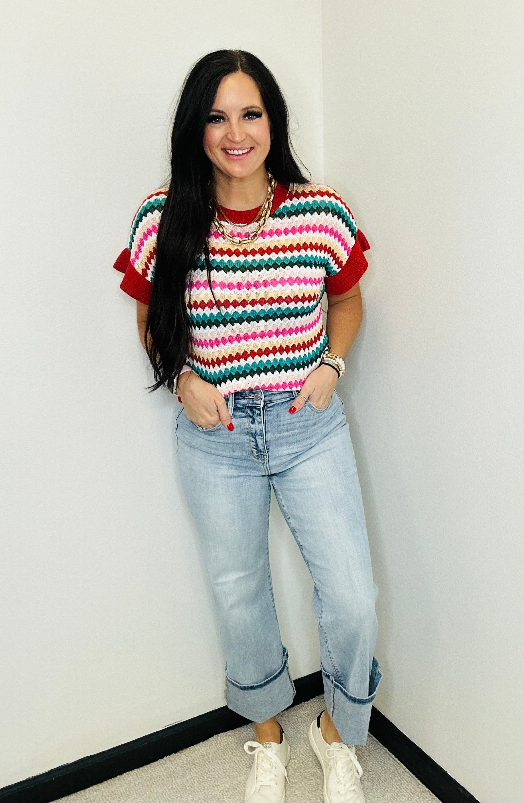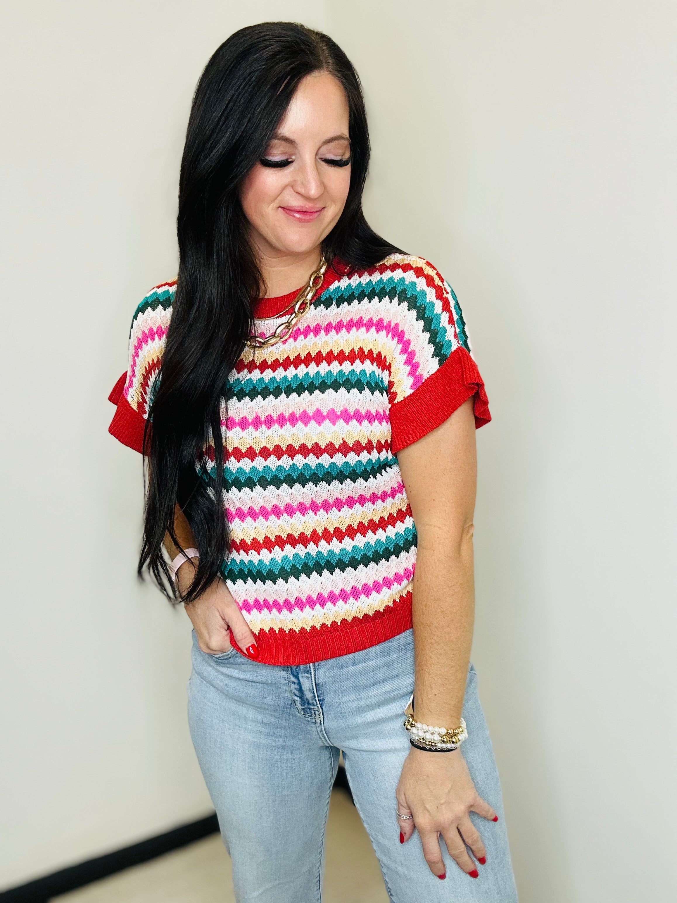Spice up your wardrobe with our "It's a Go" striped knit top! This lightweight sweater knit features a round neckline, banded ribbed neckline, and dolman sleeves for a stylish and comfortable fit. The exaggerated banded sleeve cuff and ribbed hemline add a unique touch to this must-have top.