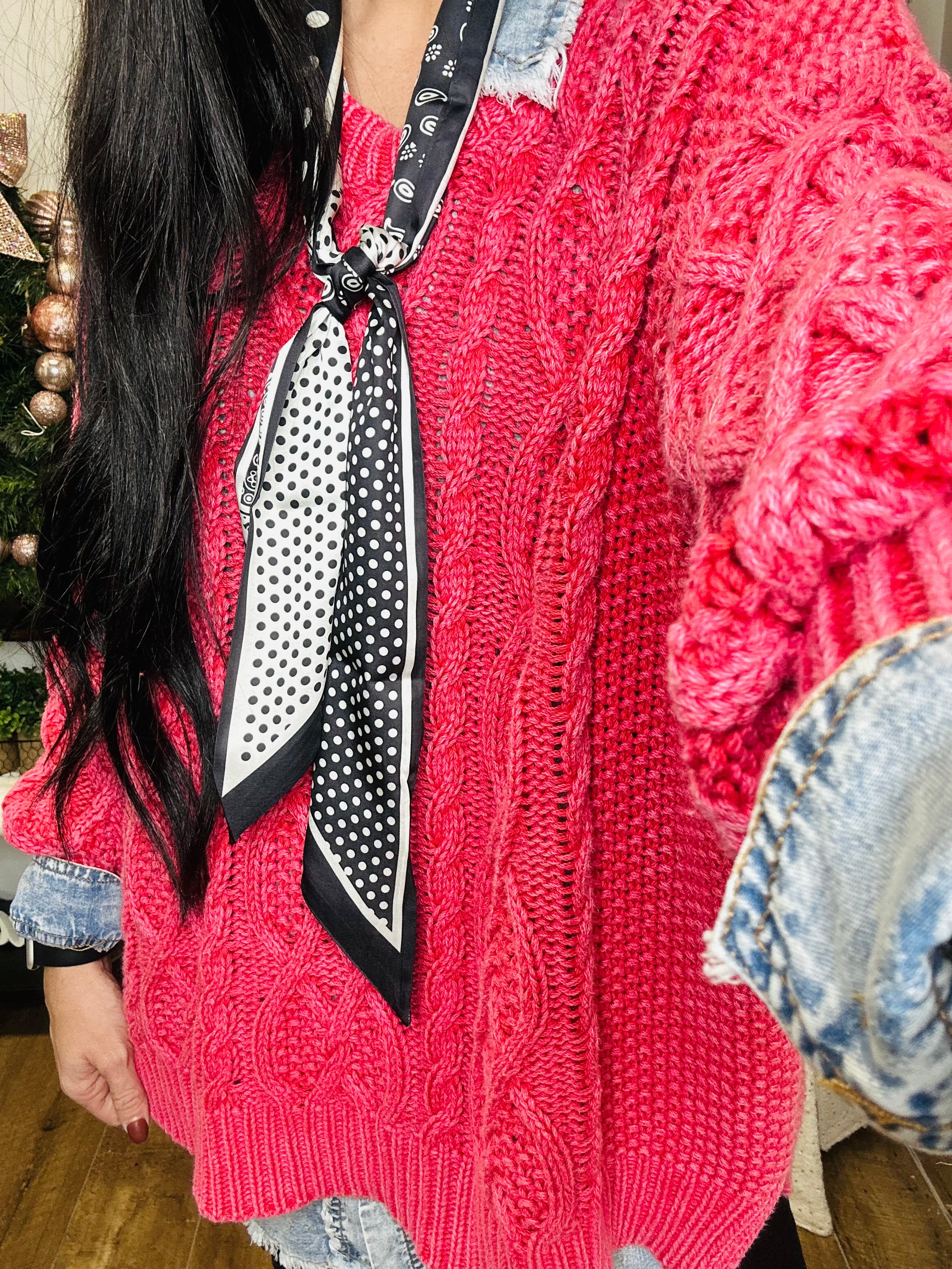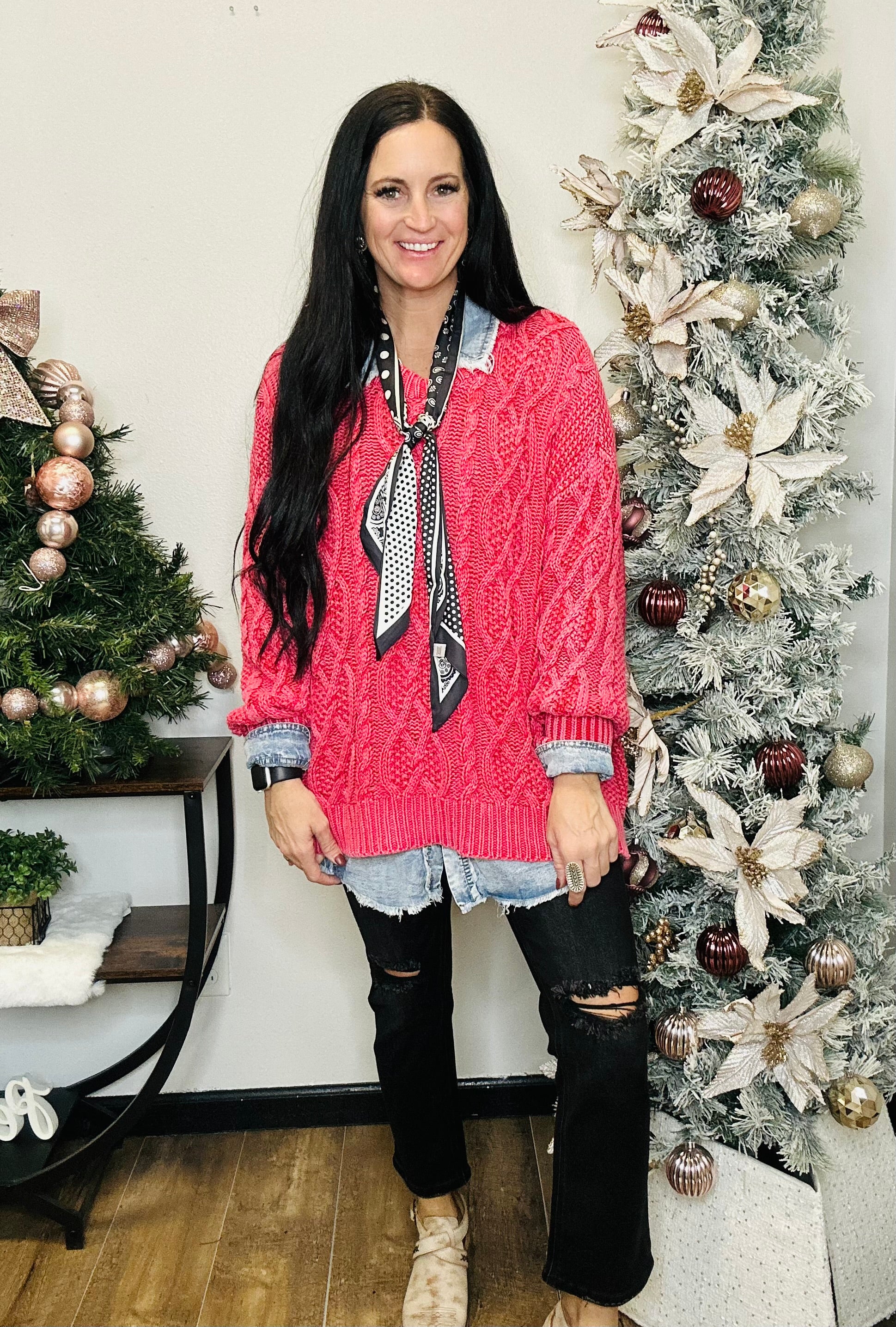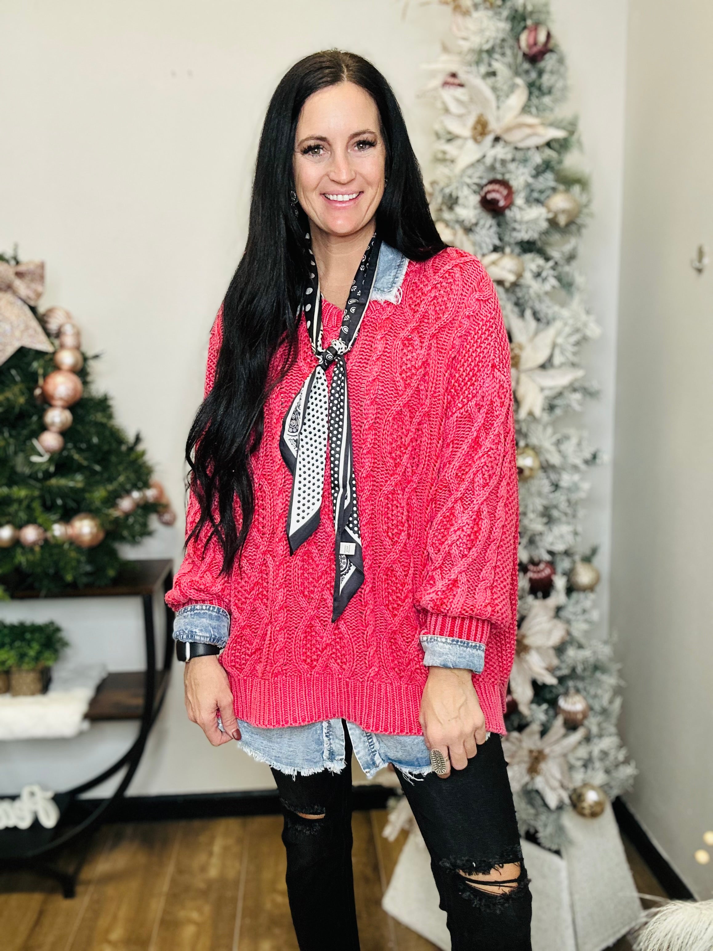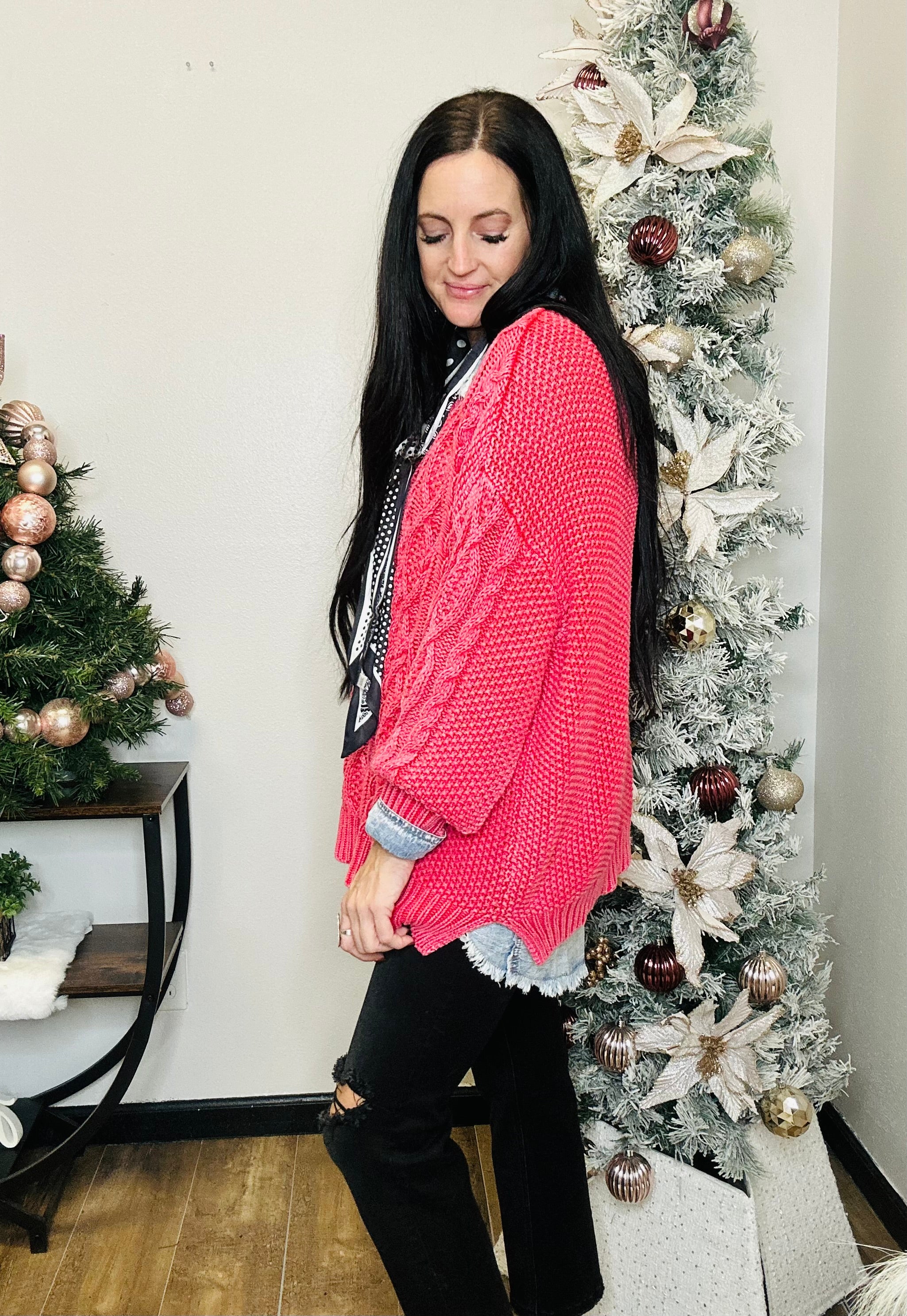 Long Sleeve Cable Knit Sweater in Raspberry - Iris