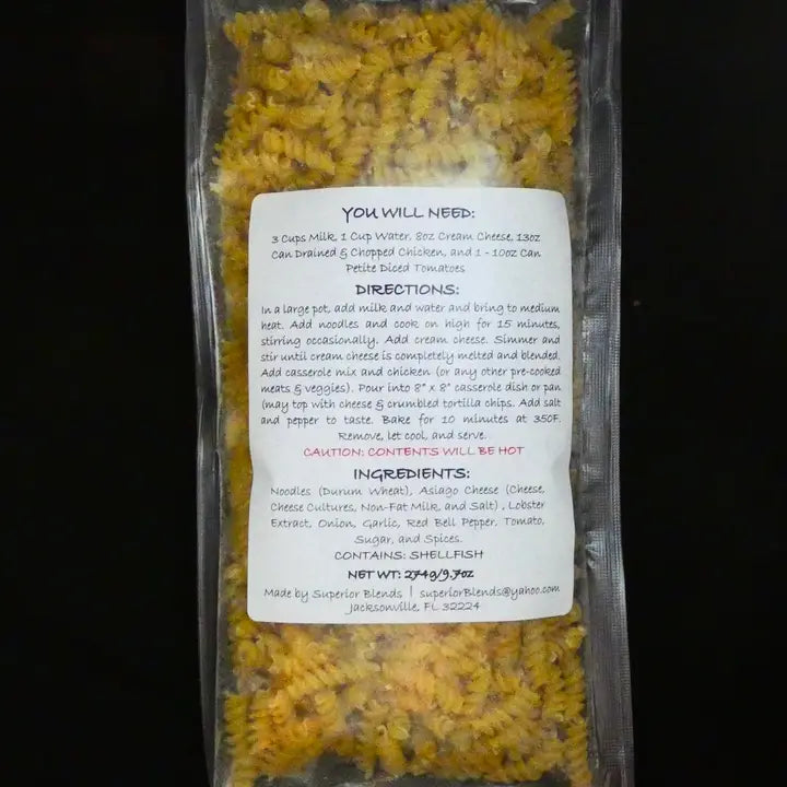 Bring restaurant-quality flavor home with our Lobster Mac N’ Cheese Casserole Mix from Superior Blends. This gourmet prepackaged mix blends creamy cheese, savory lobster extract, and a touch of onion, garlic, and red bell pepper for a rich and indulgent meal. Perfectly seasoned and easy to prepare, it’s an effortless way to impress guests or treat yourself to a little comfort food luxury—no chef skills required.
